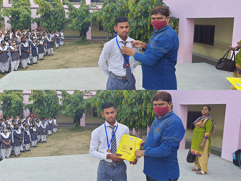 बच्चों को खेल का पुरस्कार देते सम्मनित शिक्षक राघवेंद्र सिँह